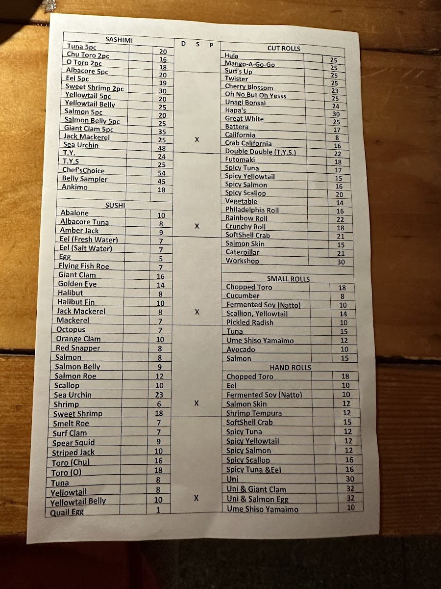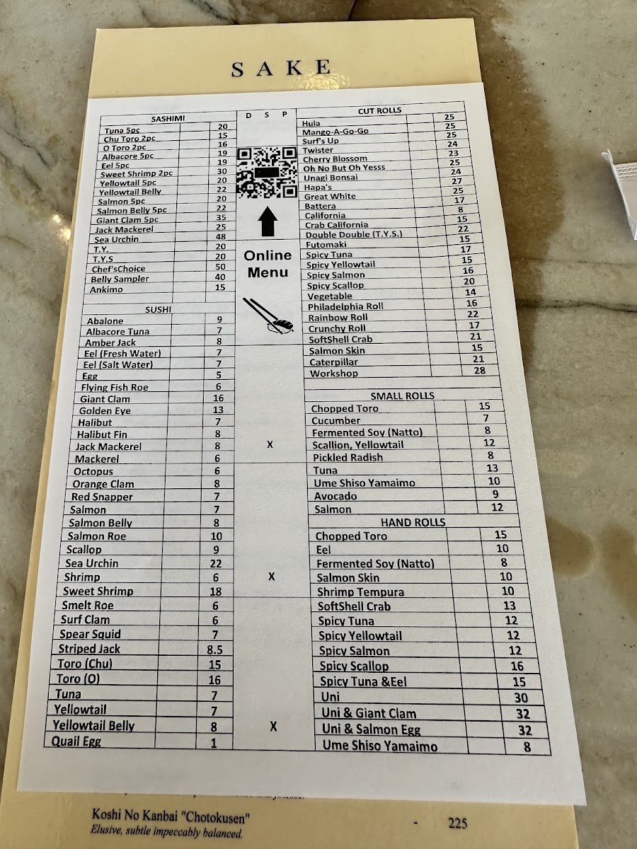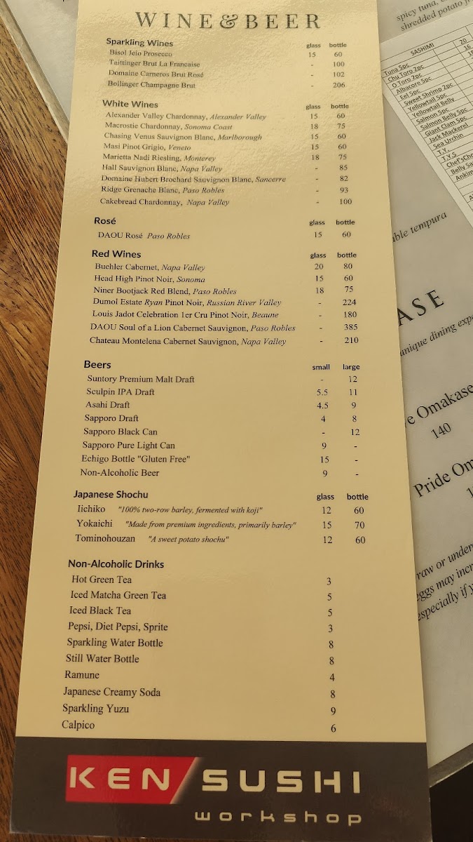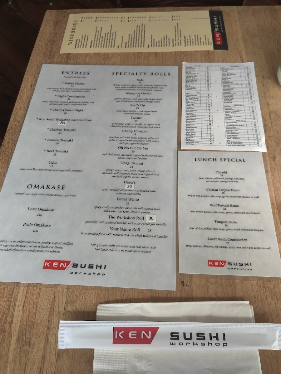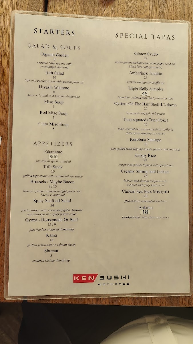 But what truly sets Ken Sushi apart is their extensive sake selection, including the beautifully aromatic Kikusui "Chrisanthemum Mist" and the bubbly Mio Sparkling Sake, perfect companions to your meal that promise to enhance your dining experience.
